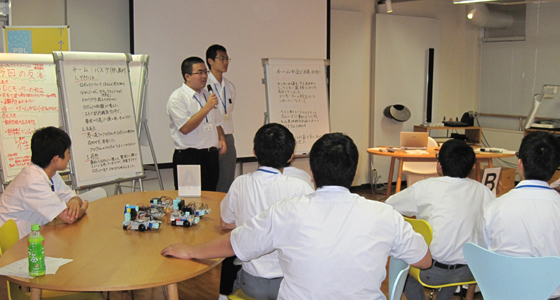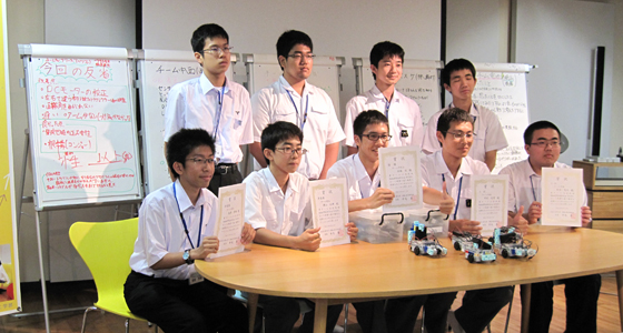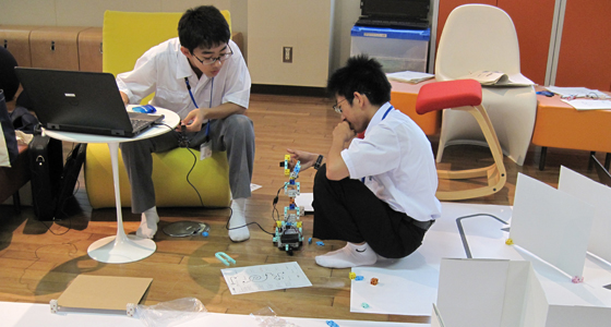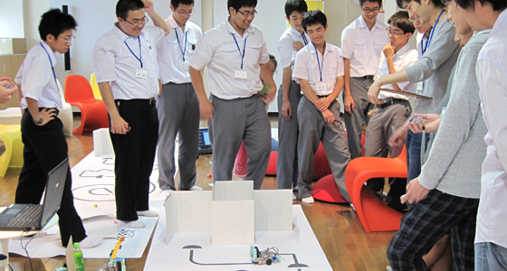 平成28年6月12日、高校版RoboSTEAM’16 in北九州が開催され、福岡県立小倉高等学校および戸畑高等学校の化学部に所属する1~3年生が参加しました。ノートPCのアイコンを使ってプログラムを組み、ブロックで作ったロボカーを走行させるものです。ライントレース上の幾つかの課題をクリアしながらタイムも併せて競うスタイルで、本学の総合システム工学科必須科目「入門PBL」でも導入されています。二人一組の両校混成のチームですが、初対面ながらどのチームも熱心に意見交換を行い、試行錯誤しながらプログラミングを改良するなど、真剣に取り組む姿が見られました。第1回目となる本コンテストは来年度も開催を予定しており、より多くの高校生の方が参加できるよう広くアナウンスを行う予定です。
