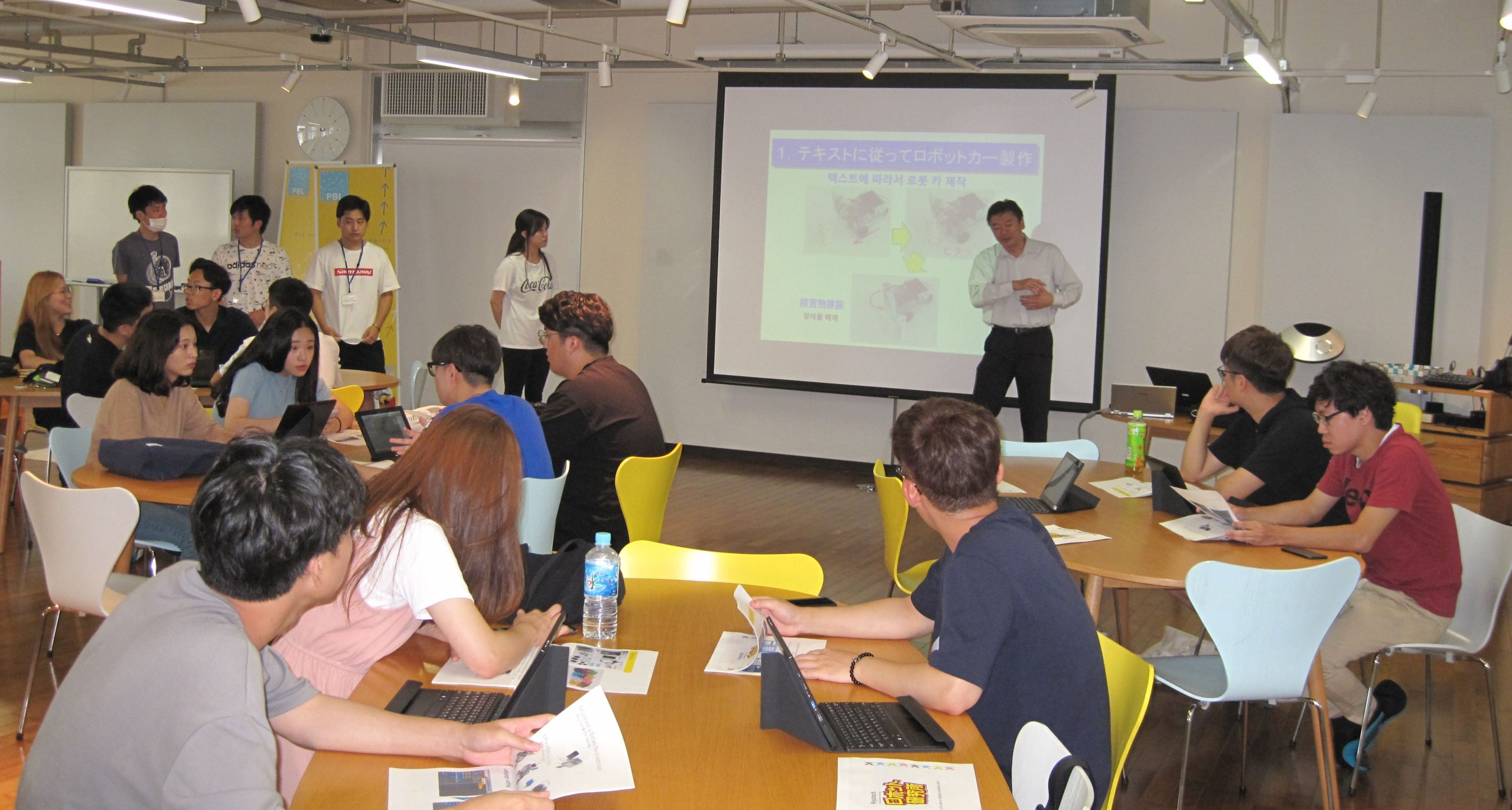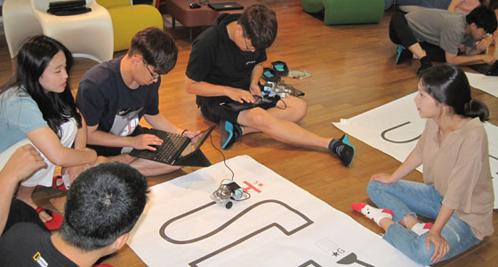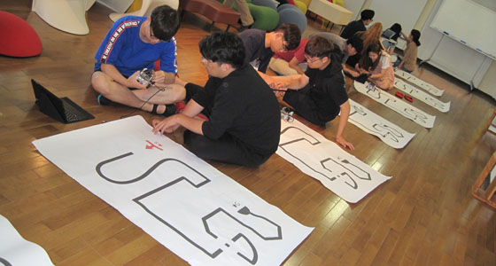 平成30年8月21日、韓国・東義大学校の日本での研修の一環として、アーテック・ロボカープログラミングを実施しました。15名の学生が参加しました。二人一組になり、ブロックでロボカーを作るところからスタートし、PCでプログラミングを行い、ロボカーを走行させました。テキストを参考にTAのアドバイスを受けながら、衝突回避自動車を作成しました。最後はライントレースの走行にもチャレンジしました。楽しい雰囲気の中、真剣に取り組む姿が見られ、3時間にわたる有意義な体験会となりました。