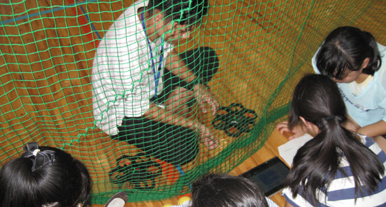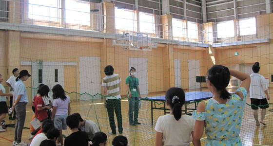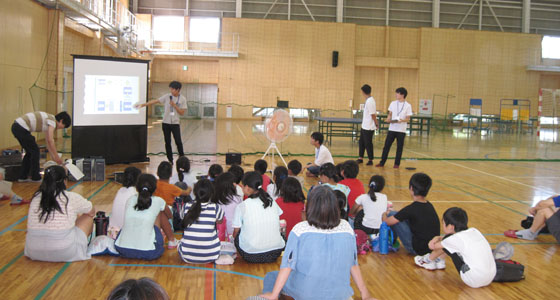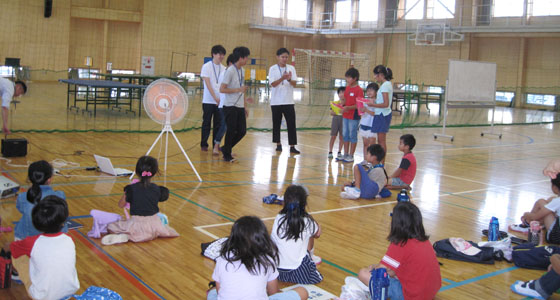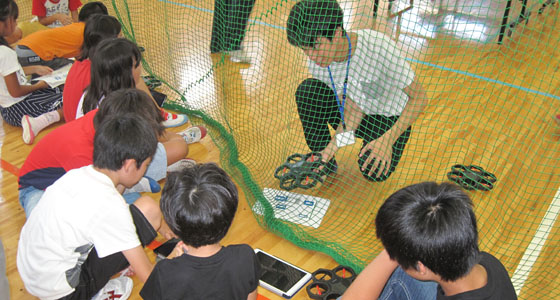 平成30年8月24日、北九州市立井堀市民センターの模擬講義「ドローンをプログラミングで飛ばしてみよう」がありました。小学生30名(1年生から6年生)が参加しました。二人一組になり、タブレット端末を使って、ドローンを前⇔後、左⇔右、上⇔下に動かす、プログラミング体験をしていただきました。TAのアドバイスを受けながら、プログラムを作成し、体育館に設置したステージで飛行させました。課題をクリアしたチームが表彰されました。楽しい雰囲気の中、真剣に取り組む姿が見られ、あっという間の90分間でした。夏休みの楽しい学びの場となったようです。