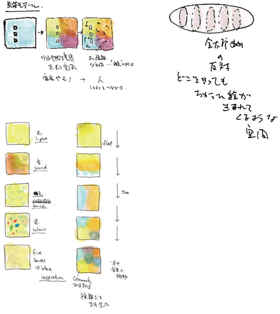 学生の主体的なアイディアを促すためのPBLプログラムと空間デザインを有機的につなげるトータルデザインを目指しました。ディスカッション、コミュニケーションを重視したPBLプログラムでは、新しい人や物との出会いや今までと異なるコミュニティに出会うことを大切にします。そのために、リラックスし、音や色を感じたり、触れるなどの五感を使うことができる柔らかい空間デザインを考えました。