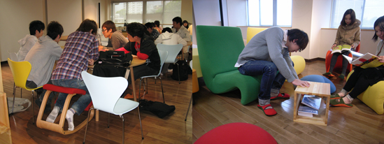 様々なアイディア、発想を促すのはどのような空間でしょうか?通常の大学の講義室は、いうならば、机と椅子 がきちんと整列した、均質な空間です。これに対して、PBLルームは、「金太郎飴」の反対で、どこをきっても違った絵がでてくるような空間を目指しました。ディスカッションやコミュニケーションを重視したPBLプログラムでは、リラックスし、頭の中をリセットできるような空間が必要なのではないかと考えました。