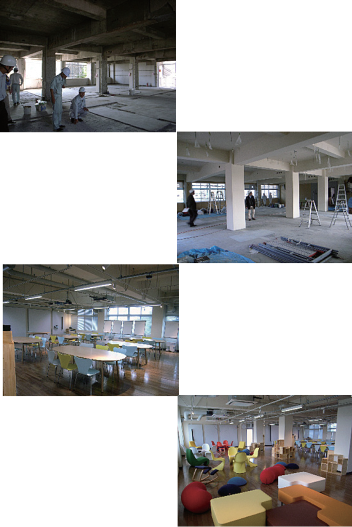 プロジェクトラボラトリの空間は、改修デザインのため、制約の多い空間でした。天井は、シーリングを取ってもらい、圧迫感を軽減しました。床は、木製のフロアとし、靴を脱いで入ります。家具の中には、本棚など学生のみんなのアイデアから生まれたものもあります。また、どうしても大きな柱が残ることになりました。しかし、この大きな柱を負としてとらえるのではなく、落ち着いた空間と家具がランダムに配置されている自由な空間をつくるゆるやかな境界として利用しました。