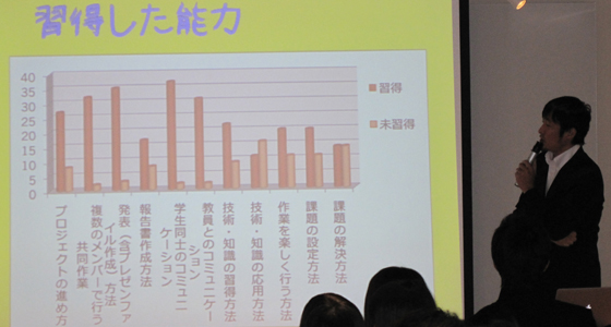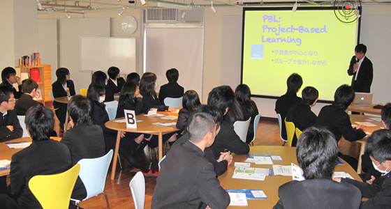 平成22年11月11日、山口県立下関西高等学校から2年生39名の皆さんが来校しました。時折インタビューも交えての和やかな雰囲気の中、初めて耳にするPBLの説明に皆さん興味を持たれたようでした。山口県からの訪問ということでスケジュールも大変な中、ラボラトリのソファエリアでは寛いでもらうことができたようです。