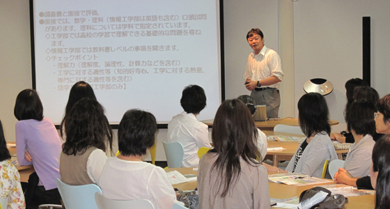 平成23年6月27日、鹿児島県立武岡台高等学校からPTA・教員38名の皆さんが来校しました。通常の講義室のイメージとは違うスペースに驚かれていましたが、早朝からの移動にお疲れの様子もなく、大学の説明やPBLの教育システムについて、どなたも熱心に耳を傾けていらっしゃいました。