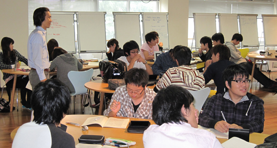 平成23年度後期人間科学・総合英語の授業がスタートしました。授業では3面スクリーンやフリップチャートなどプロジェクトラボラトリの設備を活用し、総合英語Cではグループに分かれて、TOPICとMESSAGEのキーワードを挙げながらディスカッションが行われました。その後グループごとに発表を行い、開放的な雰囲気の中、質疑応答も活発に行われました。