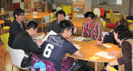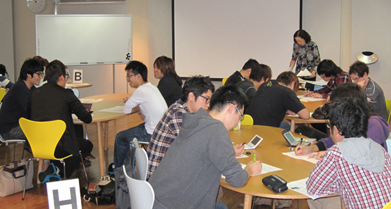 平成23年度後期人間科学・日本事情Bの授業がスタートしました。前期から引き続き、学部1年生と、中国・韓国・ラオス・マレーシア・オーストラリアからの交換留学生を交え、それぞれの国の文化について、グループでディスカッションを行います。プロジェクトラボラトリのオープンな雰囲気の中、同じ東洋圏でも背景が異なるように、自国との違い・共通点などを挙げながら、熱心に意見交換が行われました。