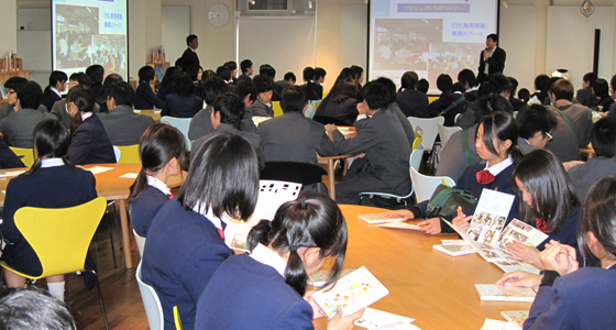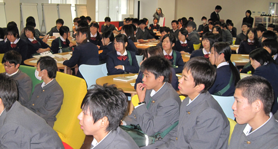 平成23年11月10日、福岡県立小郡高等学校から2年生90名の皆さんが来校しました。通常は開放感あふれるスペースのプロジェクトラボラトリですが、この日は後方まで満員となり、サブスクリーンもフル活用しての説明となりました。PBL教育プログラムの説明では、データをもとに大学生に求められる主体性やコミュニケーション能力の重要性についての解説が始まると、熱心に耳を傾け今後の進路について参考にしている様子がうかがえました。