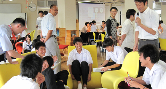 平成24年6月6日、福岡県立宗像高等学校から3年生76名の皆さんが来校しプロジェクトラボラトリで模擬授業を受講しました。PBL教育プログラムについて説明を受けた後、スマホアプリの提案という題でグループディスカッションが行われました。その後、他のメンバーや先生方にアプリをアピールし、クーポン券による「販売」を行って売上順位を競いました。ユニークでアイデアに富んだアプリが次々と発表され、引率の先生方も巻き込んでの活気溢れる授業となりました。