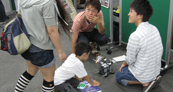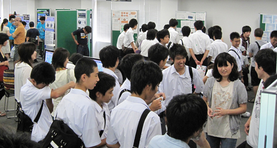 平成24年7月22日、戸畑キャンパスにてサマーサイエンスフェスタin北九州2012が開催され、PBLもブースを設けポスタープレゼンテーションを行いました。福岡県内18校より約500名の高校生および先生方が参加し、さらに約1500名もの一般市民の方々が来場され大盛況となりました。PBLでは、総合システム工学科と建設社会工学科より併せて9チームがポスターや成果物を展示し、プレゼンを行いました。学内でのプレゼントとは異なり、様々な年代の方々に工夫を凝らして説明するという貴重な実習の場となったようです。