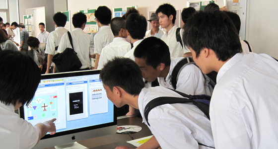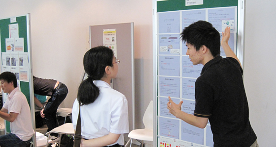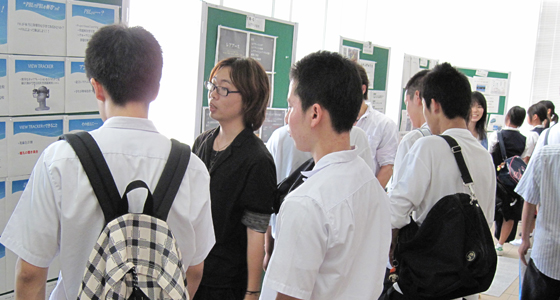 平成24年8月3・4日、オープンキャンパスが開催され、今回は工学部PBLとして独立したブースを設けました。総合システム工学科だけではなく、他学科にも参加を呼び掛け、計15チームがポスターや成果物でのプレゼンテーションを行いました。2日間で、高校生152名、父兄・一般の方42名が来場され、各チームごと質疑応答も活発に行われました。特に父兄の方々から「大変面白かった」とのご意見を多くいただき、来年度以降、さらに多くのチームが参加し充実した内容となるよう検討していくことになりました。