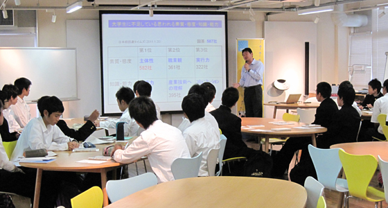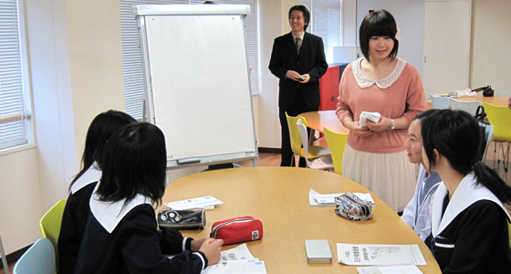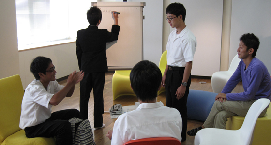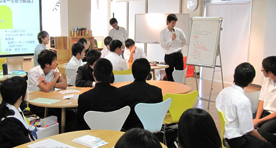 平成24年10月5日、大分県立大分舞鶴高等学校から1年生24名の皆さんが来校しプロジェクトラボラトリで模擬授業を受講しました。PBL教育プログラムについての説明を受けながら、熱心にメモをとる生徒さんも多く見受けられました。その後、「将来実現できたらいいなぁ~と思う商品」という題でグループディスカッションが行われ、代表者による商品についての紹介がありました。どのチームもユニークでアイデアに富んだ商品が次々と発表され、説明を聞いた後は、各自が良い商品と思うものに評価シールを貼って、順位を競いました。最初は緊張気味にスタートしましたが、引率の先生方も巻き込んでの活気溢れる授業となりました。