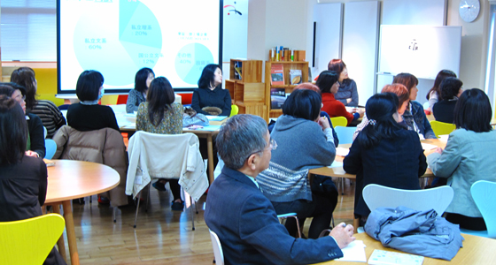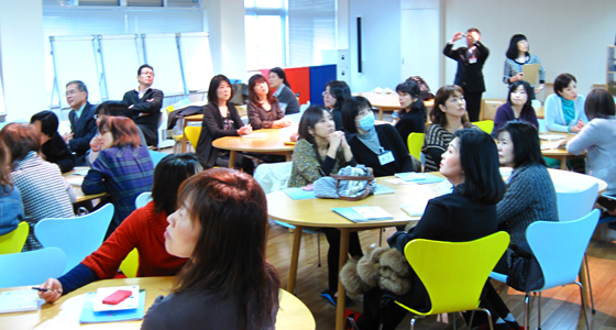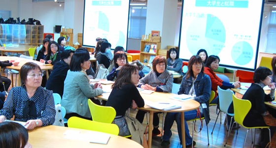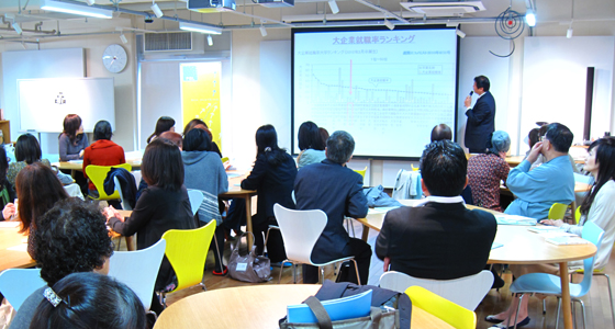 平成24年11月5日、下関中等教育学校から40名のPTAの皆さんが来校しました。中尾PBL教育推進室長より、PBL教育プログラムや就職についてのデータを交えた説明に、皆さん熱心に聞き入っておられました。ご父兄の中には男性も見受けられ、大学進学に対する関心の高さが伺われました。また、視覚障害の父兄の方のパートナーとして、盲導犬が来室し、ご主人の足元に大人しく寄り添っている姿が印象的でした。