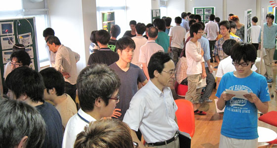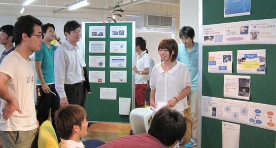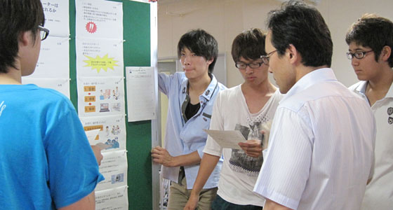 平成25年7月18日、総合システム工学科1年生による、入門PBL成果発表会がありました。全9チームによるポスターセッションが行われ、今回、教員・学生が発表内容やプレゼンなど優れていると思うチームに、シールを貼るというグループ評価を行いました。これまで授業の中で行ってきたスピーチやグループディスカッションと異なり、初めてのプレゼンテーションでしたが、どのチームも役割分担するなど工夫を凝らし熱心に説明を行っていました。