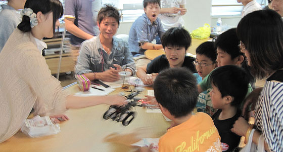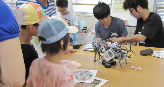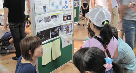 平成25年7月21日、戸畑キャンパスにてサマーサイエンスフェスタin北九州2013が開催され、プロジェクトラボラトリにてPBLブースを出展しました。総合システム工学科の他に機械知能工学科・建設社会工学科・環境デザイン研究室など計22チームが参加し、総合システム工学科PBL科目からはポスタープレゼンテーションや、ロボットの展示・操作体験を行いました。当日は福岡県内の高校生・および先生方や一般の方々計2,150名が大学を訪れ、大盛況となりました。PBLブースも400名を超える入場者があり、ロボットの操作を体験するコーナーでは順番待ちの列がでていました。学生にとっては様々な年代の方に工夫を凝らして説明するという貴重な実習の場となったようです。