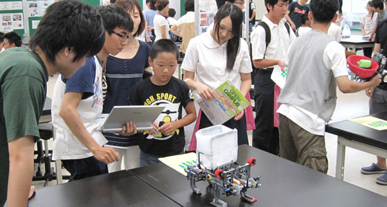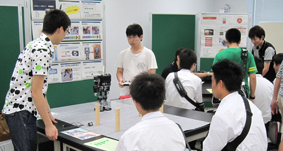 平成25年8月9日・10日、九州工業大学工学部オープンキャンパスが開催され、昨年度に引き続き、工学部PBLとして独立したブースを設けました。総合システム工学科以外に、機械知能工学科・建設社会工学科からも参加があり、計14チームがポスターや成果物でのプレゼンテーションを行いました。記録的な猛暑にも拘わらず、ブースには2日間で323名の方が来場され、各チームごと質疑応答も活発に行われました。PBLを通常の授業の中に取り入れた成果発表に、高校生をはじめ、保護者の方も大変興味をもたれ、熱心に学生の説明を聞かれていました。