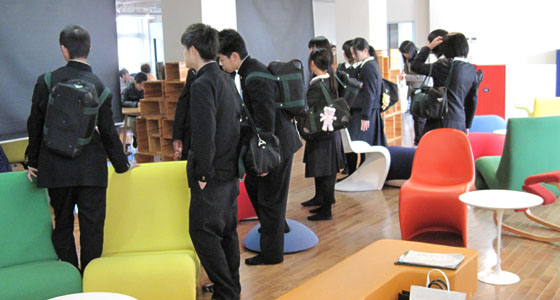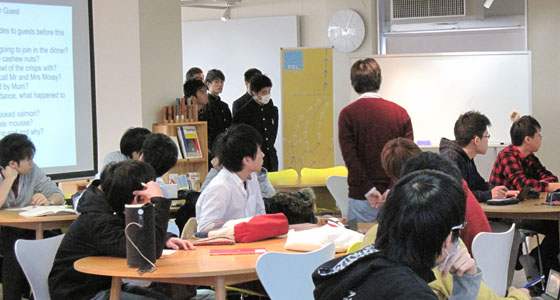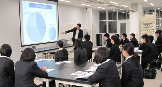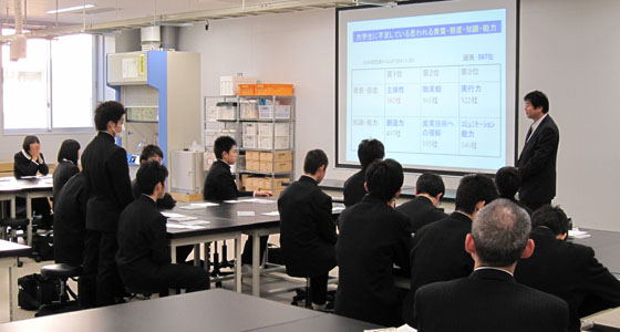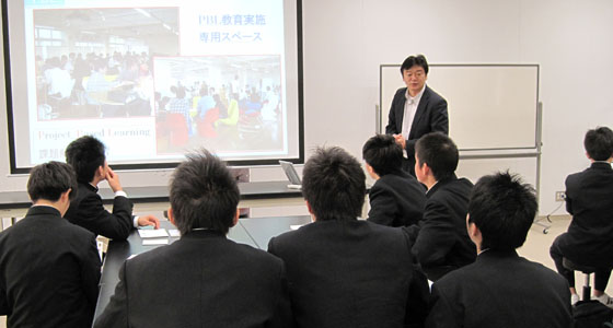 平成25年12月12日、福岡県立糸島高等学校から1年生21名の皆さんが来校しました。プロジェクトラボラトリで行われている総合英語BⅡの授業風景を見学した後、中尾PBL教育推進室長によるPBL教育プログラムについての説明を受けました。まだ高校1年生ではありますが、大学生活の先にある就職に関連して、社会が求めている人材を育成するために本学がどのような教育を行っているかなど、事例を交えての紹介に熱心に聞き入っていました。