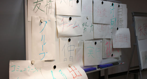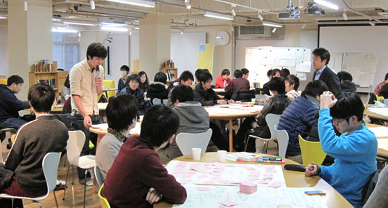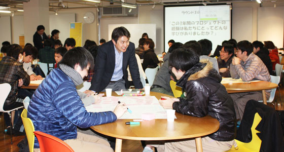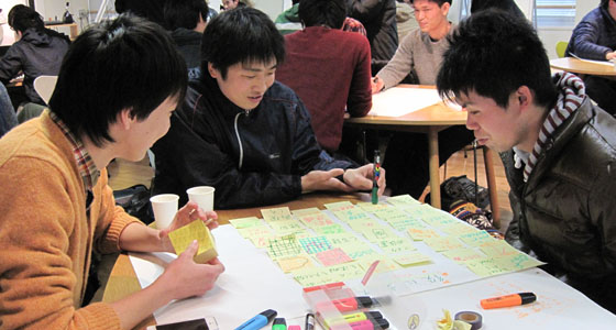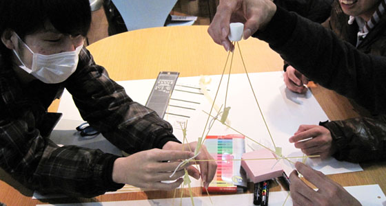 平成25年度総合システム工学PBL授業の一環としてワールドカフェを行いました。1年間のプロジェクト活動について、従来のアンケート形式からワールドカフェという手法によるディスカッション形式での振返りを実施しました。ファシリテータとして、㈱トライローグの平山猛氏を招き、マシュマロチャレンジによるアイスブレイクの後、自分のチームだけでなく、他のテーブル(チーム)を移動しながらディスカッションを重ね、プロジェクト活動を通して得た気づきや学びのキーワードを導き出し共有するという、新しい形の振り帰り授業となりました。
