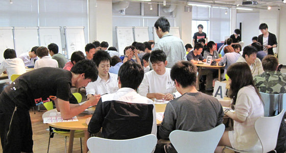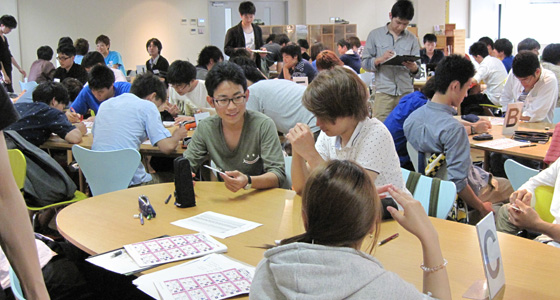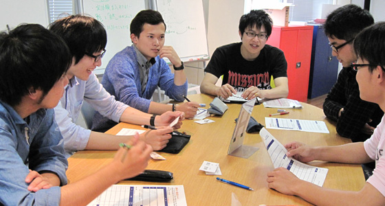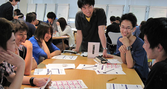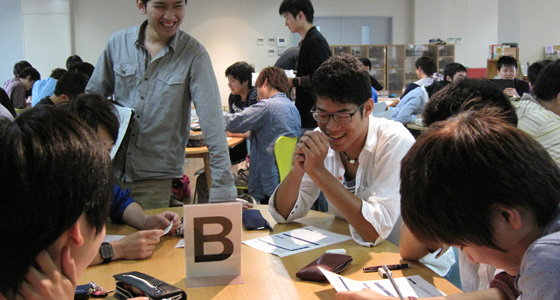 平成26年度総合システム工学入門PBL授業の一環としてイメージ交換ゲームを行いました。チーム内のメンバーの印象から、10項目の趣味や嗜好を推測したり、自分自身の意外な一面を3つ紹介し、他者はその中にある事実とは異なる一つを当てる、などのゲームを行いました。これは「自分の他者に対する思い込み」や「他者から見た自分」のギャップを確認することで相互理解のヒントを得たり、自分自身の意外な一面を考えることで自己認知を深める効果が狙いです。入学から2カ月経ち、コミュニケーションもとれつつある友達の意外な面を楽しみながら、全員演習に参加していました。