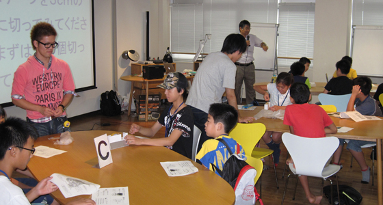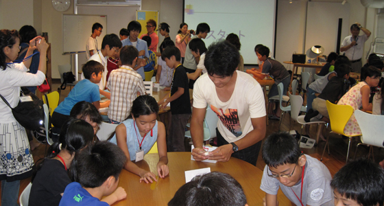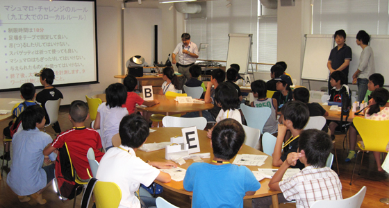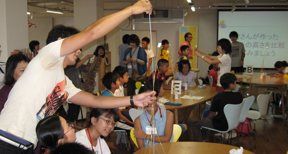 平成26年8月7日、ジュニアサイエンススクールが開催され、小学生・保護者を併せ約80名がプロジェクトラボラトリを訪れました。講義に先立ち、赤星教授によるアイスブレーク「マシュマロタワー」を参加者全員で行い、各チームでその高さを競いました。初対面で緊張気味の子どもたちも、グループのメンバーと夢中でパスタのタワーを作るうちに笑顔も見られるようになり、その後の「宇宙エレベータ」という夢のような構想に関する講義では、全員熱心に耳を傾けていました。