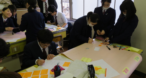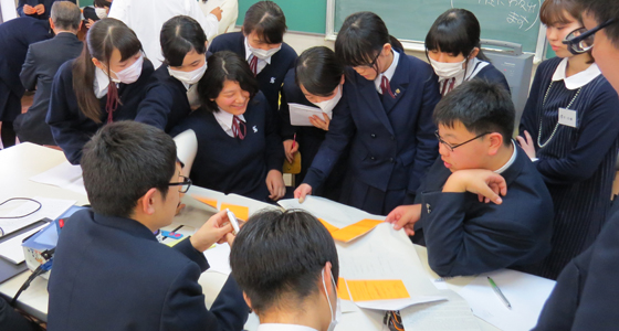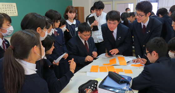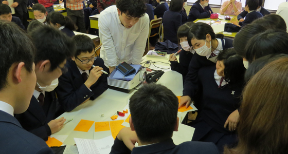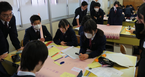 平成27年3月19日、熊本市で真和中学・高等学校PBL教職員研修会が行われました。課題解決型学習教授法研修の一環として中尾PBL教育推進室長に研修の依頼があり、27年度高校に進学する中学3年生89名の生徒さんを対象に実習を行い、その様子を先生方に見学していただきました。研修では、事前に提示したテーマで16の班に分かれグループディスカッションを行った後、各チームごとにポスター発表を行いました。また先生方には、本学で取り組んでいるPBL教育プログラムの概要について中尾室長より説明があり、総合システム工学科のカリキュラムや実施例などについて質疑応答が活発に行われました。先生方をはじめ生徒の皆さんも大変熱心に研修に取り組まれ、PBLに対する感心の高さが伺えました。