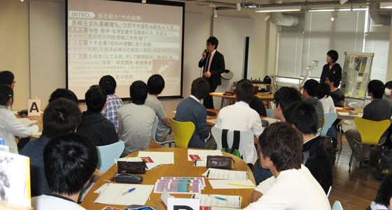 平成27年度総合システム工学入門PBL授業の一環として、本学OBの竹中結輝様による特別講演が行われました。「SelfDesign」と題しご自身の生い立ちや大学時代での体験を踏まえ、大学一年生からキャリアを意識することの重要性、大学での学びから自己実現のヒントまで、学生にとって大変興味深い内容でした。入学したばかりで就職や大学院進学についても漠然としたイメージしか持てなかった学生にとって、先輩からのメッセージで多くの気づきを得るとともに、これからの大学生活の指針となる有意義な講演となりました。