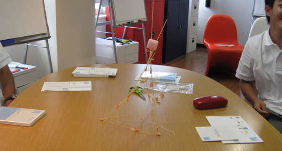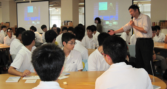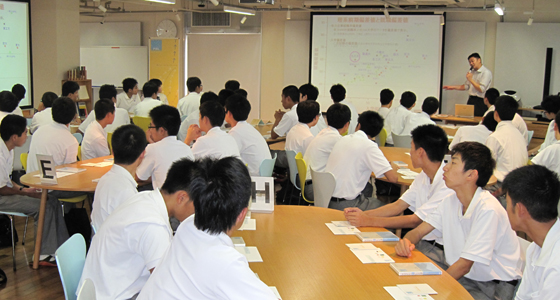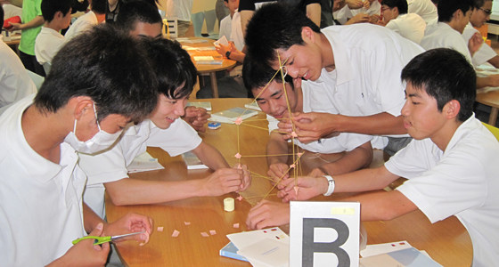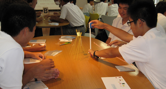 平成27年7月9日、福岡舞鶴高等学校から2年生53名の皆さんが来校しました。午前中、3班に分かれて各学科の研究室を見学した後、プロジェクトラボラトリに全員が来室し、中尾PBL教育推進室長より、総合システム工学科で実施しているPBL科目についての内容や、総合力養成を目的としたPBL教育の概要について説明がありました。その後、9班に分かれ「マシュマロチャレンジ」を体験しました。この演習は、大学で体験するチームでのプロジェクト活動の導入として初年次教育や様々な場面で実際に取り入れられているものです。制限時間のある中、各チームとも全員で真剣に取り組む様子が見られ、その後TEDの動画による振り返りを行うことで、PBLの基礎となる考え方を「体験」を通して理解してもらうことができました。
