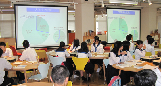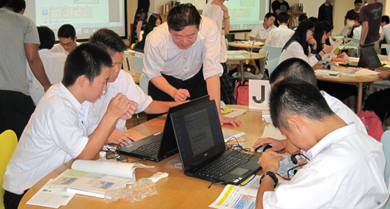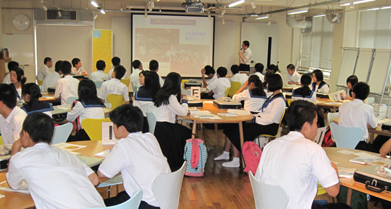 平成27年7月16日、熊本県立東稜高等学校から1年生41名の皆さんが来校しました。中尾PBL教育推進室長より、総合システム工学科で実施しているPBL科目についての内容や、PBL教育の概要についての説明が行われた後、二人一組で「ブロックロボット」の制作と操作を体験しました。今年度から総合システム工学科1年生の必須科目「入門PBL」に導入された演習で、ノートPCを用いた簡単なプログラミングが体験でき、ロボット操作も自在に行えるものです。各自テキストに沿ってロボットを作成し、基本動作に加えて様々な動きをプラスする作業も熱心にこなしていました。また、プロジェクトラボラトリのソファエリアで自由にロボットを操作するチームもあり全員楽しく演習に参加していました。