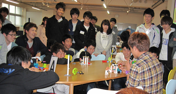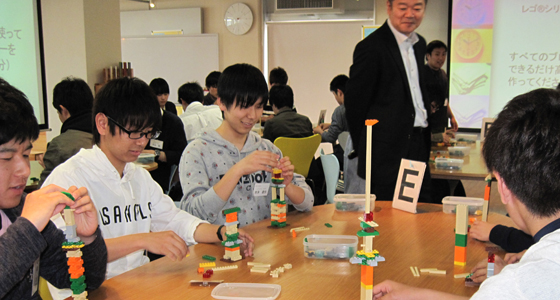 平成28年度総合システム工学入門PBL授業の一環としてレゴ®シリアスプレイ®を行いました。感情やイメージといった内面を、レゴを通して具現化することで、自己分析を行うと同時に他者に伝える力を養うことを目的とした演習です。各班ごとにブロックに慣れることから始まり「好奇心」「情熱」といった抽象的なテーマで作品を製作し、作品を通して他者に説明するという、これまで経験したことのない演習に学生たちは熱心に取り組みました。最終段階では、自分の作品とメンバーの作品を合体させ、その作品のストーリーを全員で共有しました。発表会では、メンバー全員が他班のメンバーに自分たちの作品説明を行い、どのグループでも興味深く熱心に聞き入る姿が見られました。