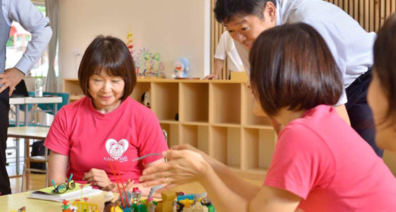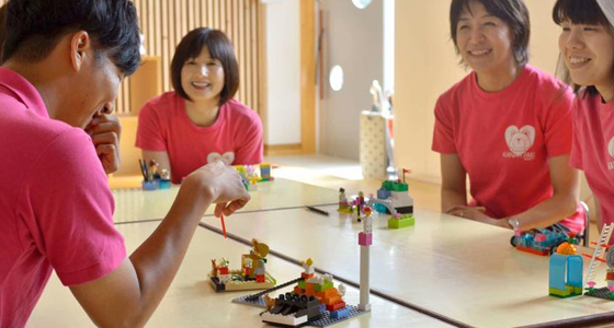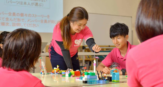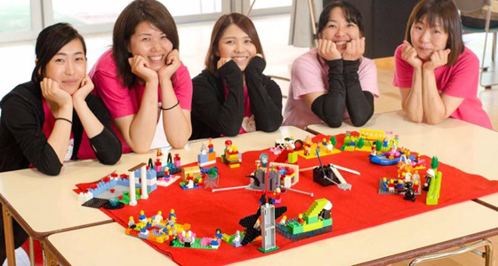 平成28年7月30日、福岡市城南区のかなやま幼稚園にて行われた職員研修の一環として、レゴシリアスプレイによるワークショップを実施しました。5・6名からなる2つのグループに分かれ、保育をする上で最も大事にしていることや、解決したい問題点を各自ブロックで作った「作品」を介して表現し、他のメンバーに説明を行うユニークな手法です。後半は「あなたが考える理想のかなやま幼稚園」という個人作品を統合してチームが目指す理想の幼稚園像を作り、これまでの個人の作品も加えたストーリーを全員でシェアした後、他のグループに解説を行いました。通常のミーティングや会議とは違った形で意見交換が行えるため、和やかな雰囲気の中にも積極的にチームの作品作りに取り組まれる姿が見られ、保育に対する思いや情熱を、目に見える形で共有することができたようです。日頃から笑顔で園児と向き合っておられる先生方の教育者としての真摯な姿に、PBL教育推進室スタッフも感銘を受けた研修となりました。