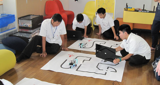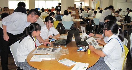 平成28年9月16日、筑紫台高等学校の模擬授業がプロジェクトラボラトリで行われました。2年生57名が参加しました。中尾PBL教育推進室長より、PBL教育についての説明が行われた後、テキストに沿って、プログラミングの製作を体験していただきました。二人一組で、PCを用いてプログラミングを行った後、ロボットカーを走行させ、完成後はライントレースによるチーム対抗コンテストが行われました。ライントレースでは、いくつかの関門クリアに挑戦し、最後にタイムを競い合いました。限られた時間でしたが、TAのアドバイスを受けながら、熱心に取り組みました。 /p>