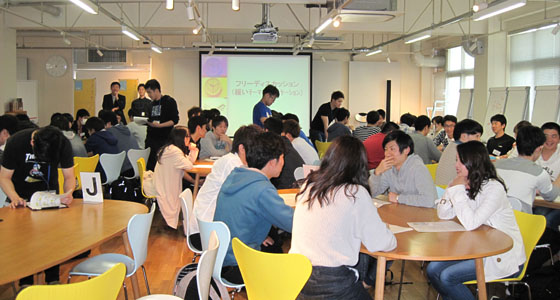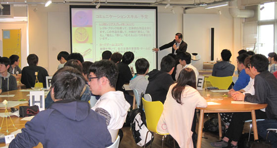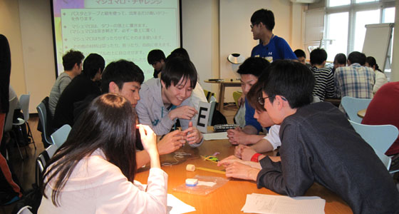 平成29年度総合システム工学入門PBL授業の一環として「マシュマロチャレンジ」でのアイスブレイクを行いました。限られた時間と道具でタワーを建て、てっぺんにマシュマロを刺し、1番マシュマロの位置が高かったチームが勝ちというゲームです。このゲームによって、チームビルディングでの課題や気づきを得ることができます。学生たちの積極的に取り組む姿が見られ、活気のある授業となりました。