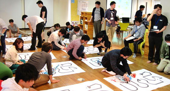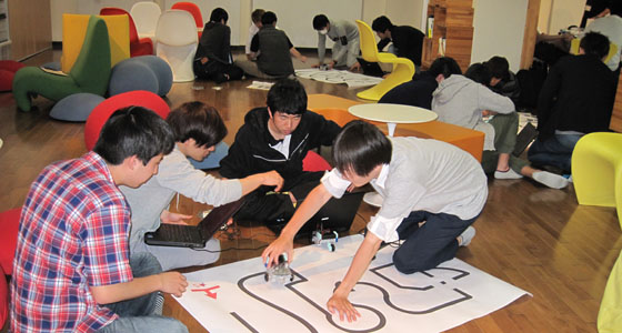 平成29年度総合システム工学入門PBL授業の一環として、ブロックロボット製作を行いました。二人一組で、ロボットカーを製作し、ライントレース上を走行させ、いくつかの課題クリアに挑戦し、最後にタイムを競い合いました。どのチームも試行錯誤しながら熱心に取り組み、授業時間外も自主的にプロジェクトラボラトリで遅くまで作業を行いました。最終日には白熱したタイムトライアルレースが行われました。