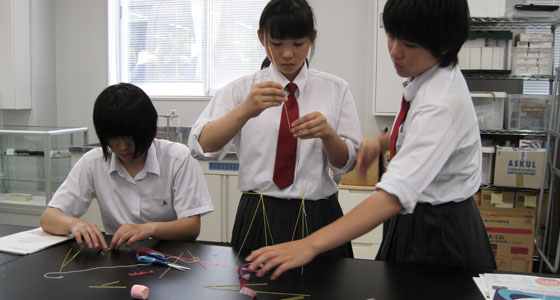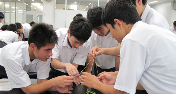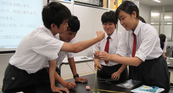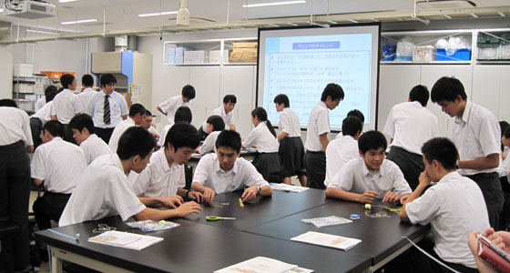 平成29年7月6日、福岡市立福岡西陵高等学校の模擬講義がサイエンス工房で行われました。2年生40名が参加しました。中尾PBL教育推進室長より、大学の説明が行われた後「マシュマロチャレンジ」でのアイスブレイクを行いました。乾麺のパスタ、テープ、ひも、マシュマロを使って、自立可能なタワーを立て、最も高いタワーを作ったチームの優勝となるゲームです。このゲームによって、チームビルディングでの課題や気づきを得ることができます。試行錯誤しながら熱心に取り組む姿が見られました。