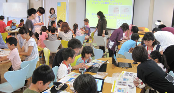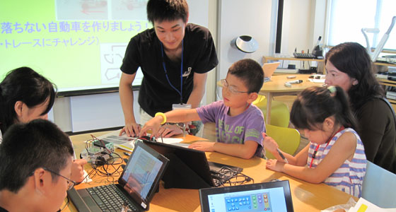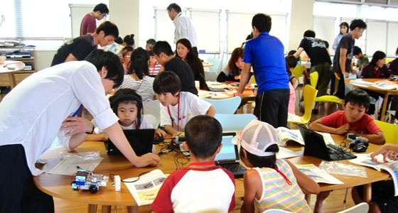 平成29年8月23日、北九州市立泉台市民センターの模擬授業が、プロジェクトラボラトリにて行われました。小学生42名とその保護者、スタッフの方が来場されました。2人1組になってブロックでロボカーを組み立て、ノートPCでプログラムを行い、走行させました。保護者の方と一緒にロボカー作りを楽しむ姿も見られました。夏休みの楽しい学びとなったようです。