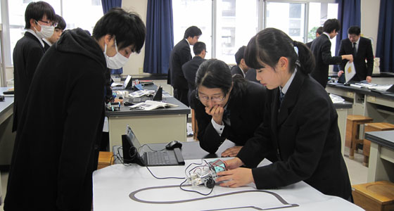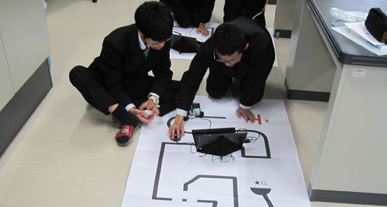 平成29年11月7日、山口県立下関中等教育学校にて模擬講義が行われました。1.2年生27名が参加しました。中尾PBL教育推進室長より、大学説明が行われた後、テキストに沿って、衝突回避自動車を作成しました。二人一組になり、ロボカーを組み立て、PCを用いてプログラミングを行った後、ロボカーを走行させました。最後はライントレースの走行にもチャレンジしました。TAのアドバイスを受け、真剣に取り組む姿が見られました。