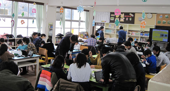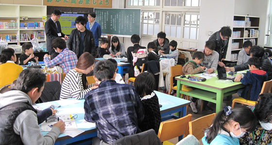 平成29年12月16日、北九州市立到津小学校で出前講義が行われました。家庭教育学級の生徒21名とその保護者22名が参加しました。親子チームで、ロボカーを組み立て、ノートPCでプログラムを行い、ロボカーを走行させました。大学生スタッフのサポートを受けながら、テキストの衝突回避までのプログラム作成を体験していただきました。保護者の方と一緒にロボカー作りを楽しむ姿が見られました。