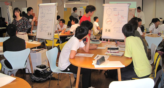 平成30年度前期物理学Ⅰ(電気電子工学科1年)の授業をグループ学習の形式で行いました。今回5名のグループで課題に取り組むアクティブラーニングのスタイルで実施されました。前半は、各班ごとに慣性モーメントの計算をして、意見を出し合いながら、フリップチャートに回答を書き、後半は全員が他班のメンバーに自分たちの回答説明を行う構成で、解説を熱心に聞く姿が見られました。他者に説明することで理解度を深める画期的な授業となりました。